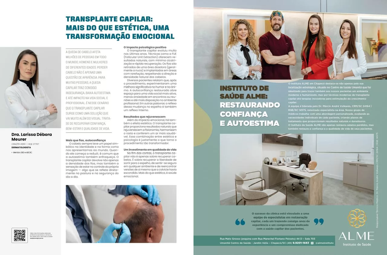 A queda de cabelo vai muito além da estética: ela impacta diretamente a autoestima, a confiança e o bem-estar emocional. Pensando nisso, o Instituto de Saúde ALME oferece transplante capilar de alta performance, unindo tecnologia avançada, segurança médica e uma equipe de especialistas altamente qualificados para transformar vidas.