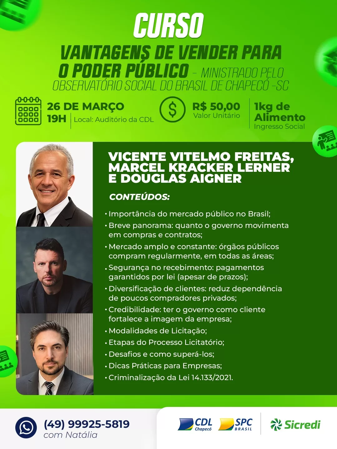 As inscrições podem ser feitas pelo telefone (49) 99925-5819 com a analista comercial da CDL, Natália Mônego. 📞