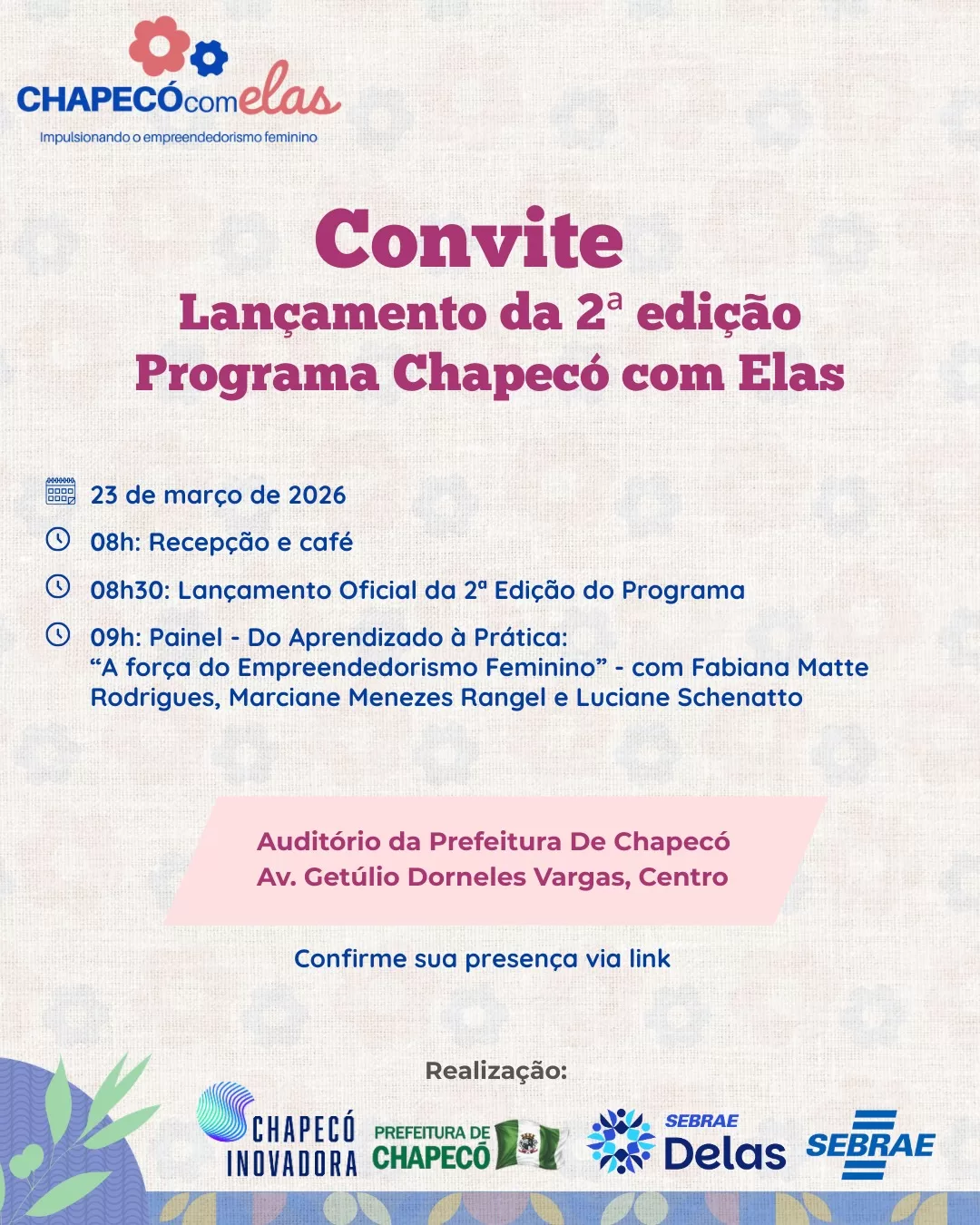 Atenção! Já estão abertas as confirmações para o lançamento do Chapecó com Elas 2026, uma iniciativa que vem ganhando destaque e fortalecendo o protagonismo feminino no município.