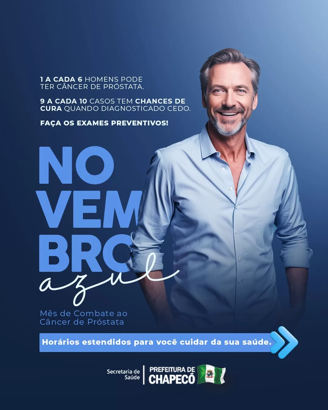 A Prefeitura de Chapecó, por meio da Secretaria de Saúde, promove nesta terça-feira (4) e no dia 18 de novembro ações do Novembro Azul com atendimento estendido nas Unidades de Saúde, das 18h às 22h. As atividades têm foco na prevenção, no diagnóstico precoce e na ampliação do acesso dos homens aos serviços de saúde.