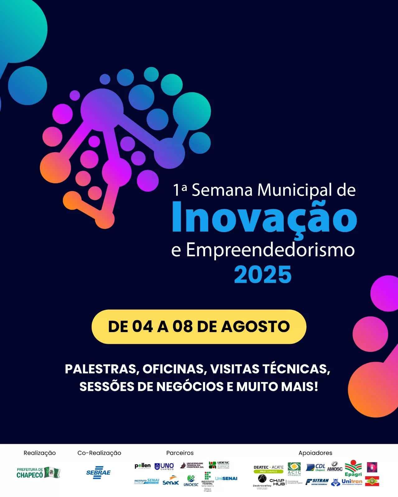 A Prefeitura de Chapecó, por meio da Secretaria de Desenvolvimento Econômico, Turismo e Inovação, realiza de 04 a 08 de agosto, em Chapecó, a Primeira Semana Municipal de Inovação e Empreendedorismo. O evento que acontecerá no Centro de Eventos Plínio Arlindo de Nes, conta com apoio das universidades, empresas, instituições públicas, entidades setoriais e organizações da sociedade civil que compõem o ecossistema local de inovação.