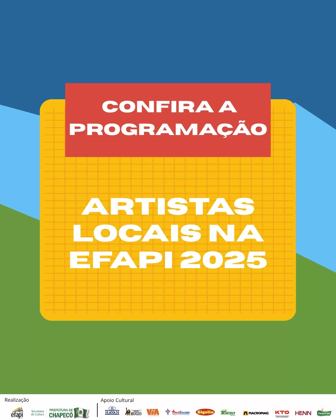 A Prefeitura Municipal de Chapecó, por meio da Secretaria de Cultura, divulgou as atrações locais que comporão a programação do Palco Nossa Arte, espaço dedicado à apresentação de artistas chapecoenses na Efapi do Brasil 2025.