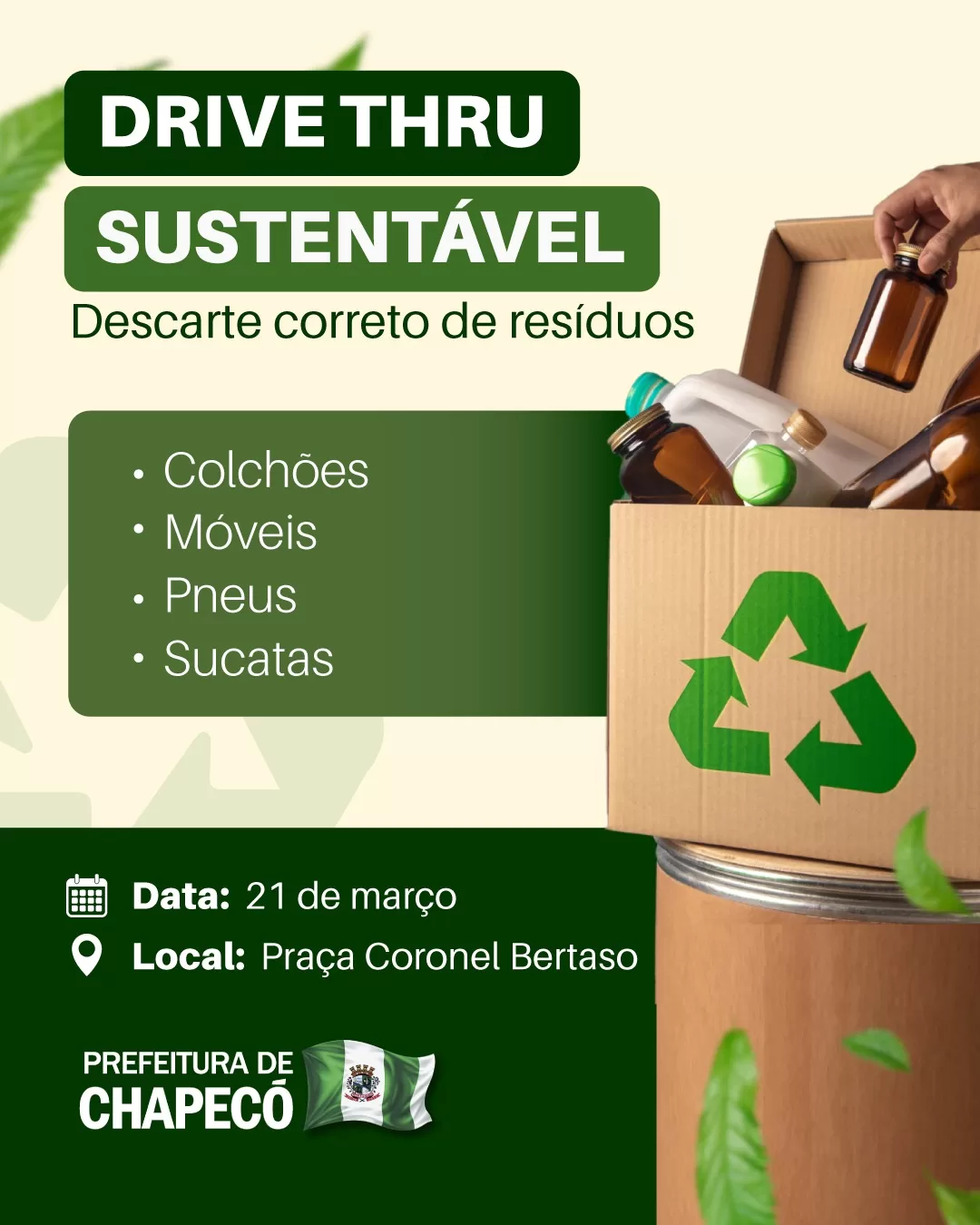 A Prefeitura de Chapecó realiza neste sábado (21) mais uma edição do Drive Thru Sustentável – Cidade Limpa, uma importante ação de educação ambiental e coleta de resíduos recicláveis.