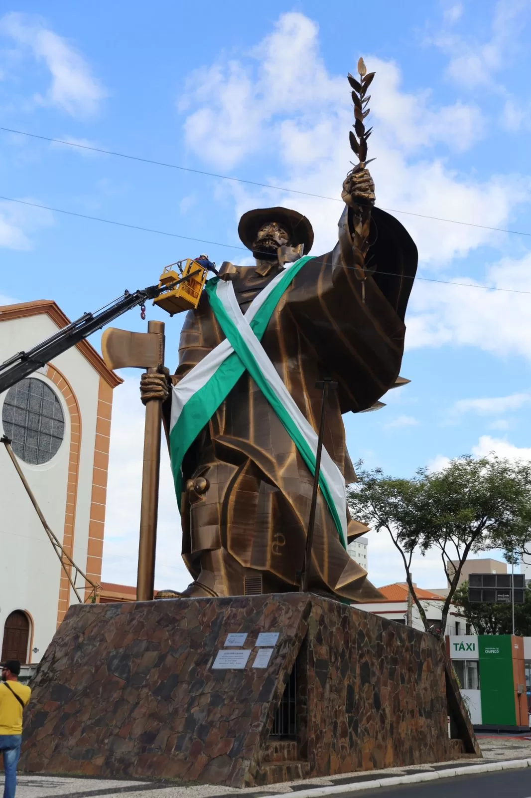 A Prefeitura de Chapecó realizou, nesta terça-feira (18), a decoração do monumento O Desbravador, que ganhou faixas nas cores verde e branca. A iniciativa busca mobilizar a comunidade para dois importantes eventos esportivos que movimentam a cidade nesta semana.