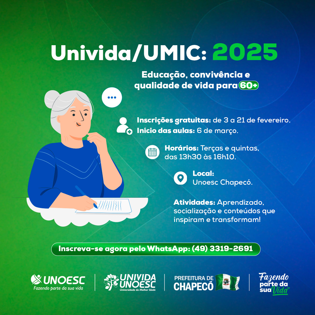 A Unoesc Chapecó anuncia o início do período de inscrições para o programa Universidade da Melhor Idade de Chapecó, que a partir deste ano passa a ser chamada de Univida, não mais UMIC. Um projeto gratuito que integra educação, socialização e inclusão para pessoas com 60 anos ou mais. As inscrições podem ser realizadas de 3 a 21 de fevereiro, das 13h30 às 17h30, com início das aulas marcado para 6 de março. As atividades ocorrerão às terças e quintas-feiras, das 13h30 às 16h10, seguidas de um momento de socialização.